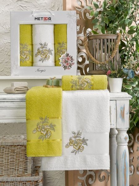 Набор махровых полотенец METEOR с достоинством украсит любую ванную комнату. Классические модели махровых полотенец, доступные для заказа оптом, декорированы вышивкой сплетения листьев, имеют мягкую махру, упакованы в красивую коробку с крышкой от турецкого производителя NERGIS .